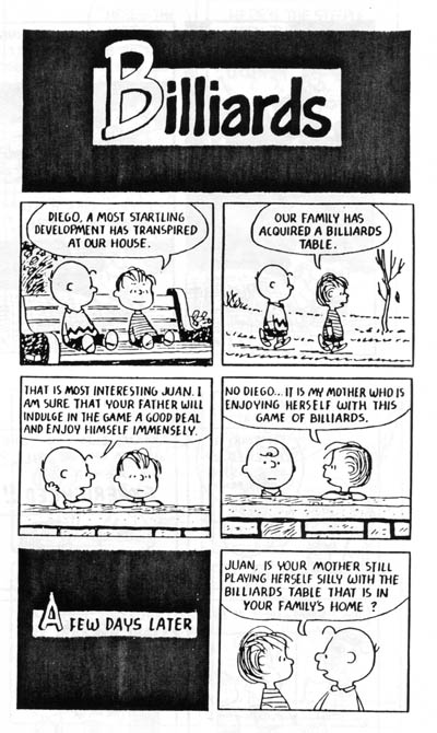 The sacrilegious zine was a little bit brilliant, with one extended portion called ‘Billiards‘ exceptionally inspired. The other parts are silly fun – pretty juvenile really in their humor, but enjoyably so. ‘Billiards‘ is far more surreal and inspired, with a full story arc and character development. The whole thing makes for a delightful satire of the source material.