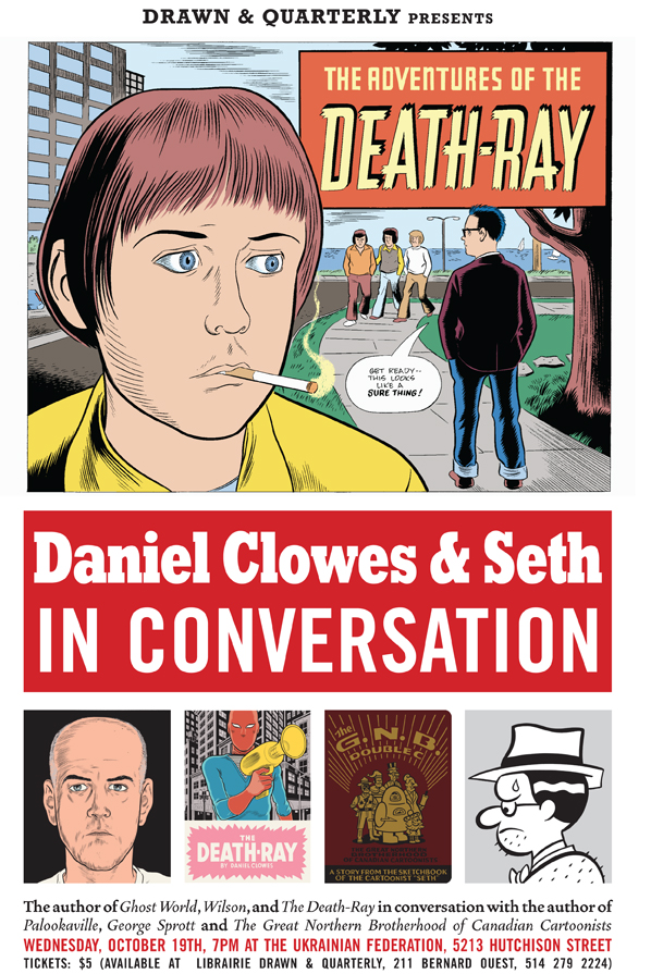Item! The Dan Clowes and Seth tour rolls into Montreal tonite at the Ukranian Federation Hall. The duo perform their surely by now well-polished interview schtick with the help of moderator Mariko Tamaki in Toronto on Thursday.