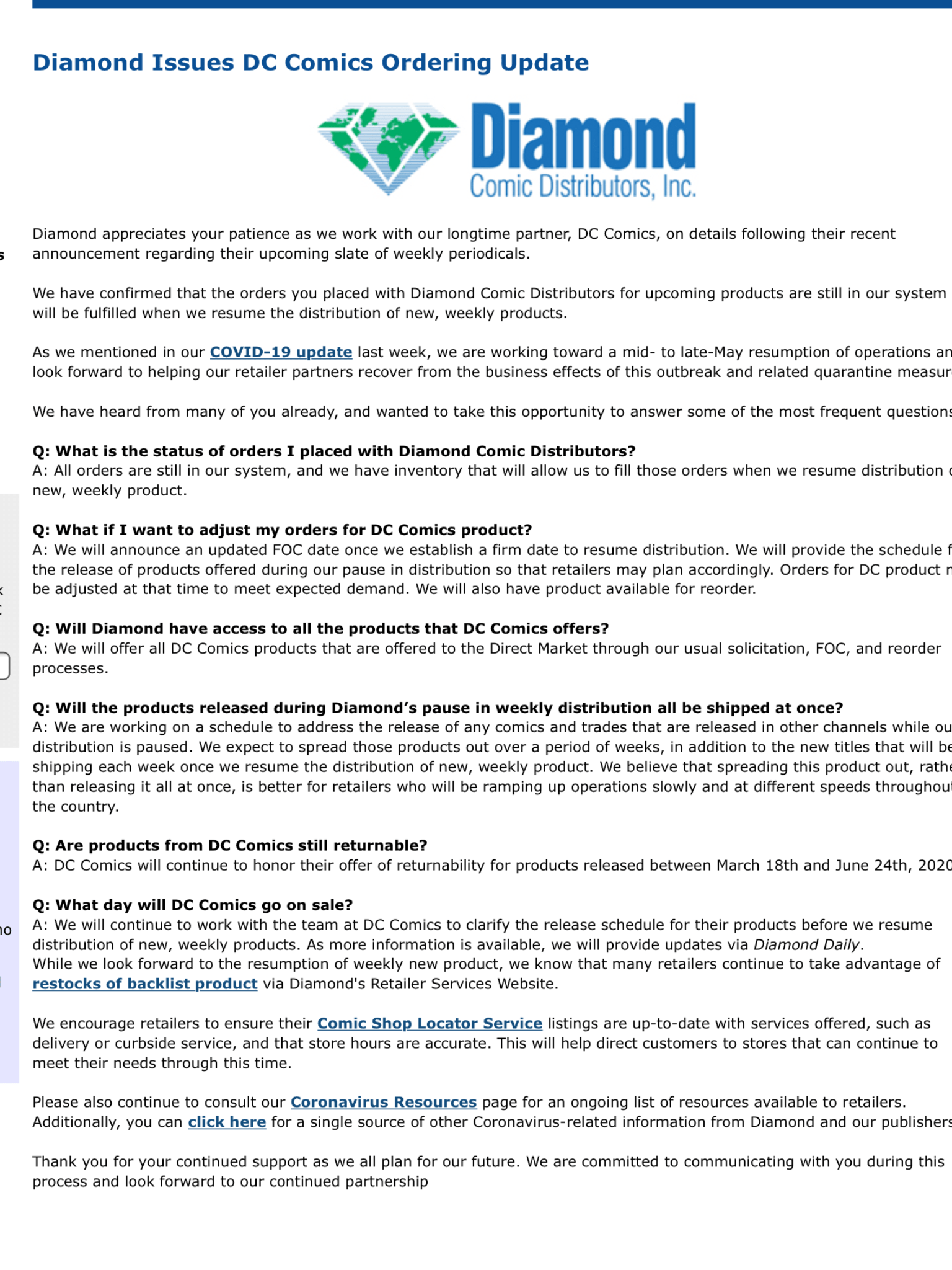 “When Diamond Comic Distributors announced a temporary stoppage of comic shipments, stores were happy. Previous… stores were faced with the decision of continuing to receive shipments that they would not be able to sell…” “It would be optimal that it should be safe for customers and staff for stores to reopen before having to receive new products.”