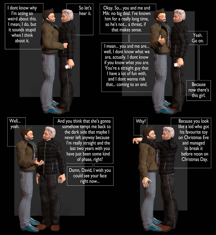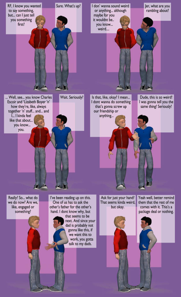 He published two books collecting the original strips, titled ‘Doc and Raider: Caught on Tape’ (1994) and ‘Doc and Raider: Incredibly Lifelike’ (1996). He then retired the first run of the regular strip in 1997, but drew two five-page stories for the Little Sister’s Defence Fund anthologies ‘What’s Right and What’s Wrong’ in 2002. Martin then revived the strip online using 3D models, and has published a number of anthologies from that run, including ‘Canadian: Hope That’s Okay’, ‘Tastefully Canadian’, and ‘Frankly Canadian’. Doc and Raider currently stands as one of the longest running LGBTQ comic strips in history as well as the second longest Canadian strip after For Better or For Worse by Lynn Johnston.