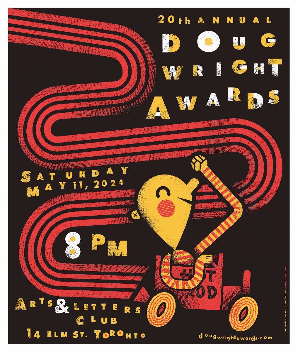 The 20th annual Doug Wright Awards takes place on Saturday, May 11th, at 8 p.m. ET, at the Arts & Letters Club, 14 Elm Street, Toronto, hosted by Dustin Harbin. The event will also be livestreamed on YouTube.